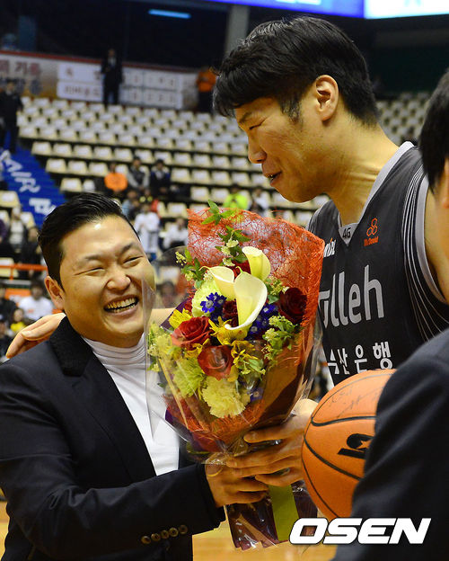 19일 오후 부산 사직실내체육관서 열린 '2012-2013 KB국민카드 남자프로농구' 부산 KT와 전주 KCC의 경기에 앞서 가수 싸이가 서장훈에게 꽃다발을 전달하고 있다