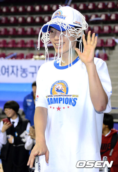 우리은행 임영희가 그물 커팅 후 머리에 쓰고 포즈를 취하고 있다. /sunday@osen.co.kr
