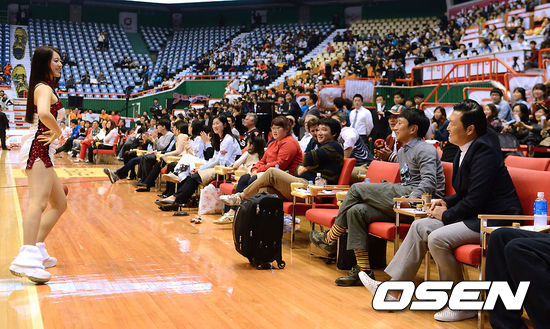 19일 오후 부산 사직실내체육관서 열린 '2012-2013 KB국민카드 남자프로농구' 부산 KT와 전주 KCC의 경기, 싸이가 치어리더의 강남스타일 댄스를 지켜보고 있다