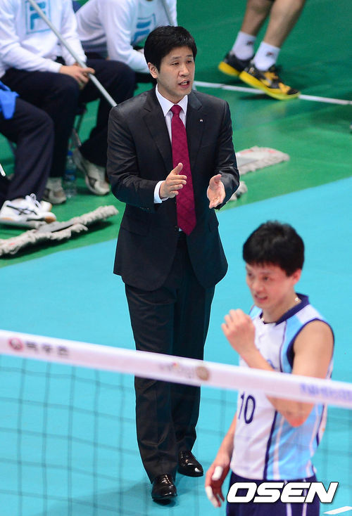 19일 오후 인천 도원체육관에서 열린 '2012-2013 NH농협 V-리그' 플레이오프 2차전 대한항공과 현대캐피탈의 경기 1세트 김종민 감독대행이 선수들을 격려하고 있다.