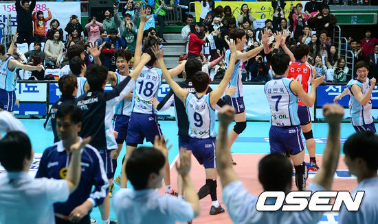19일 오후 인천 도원체육관에서 열린 '2012-2013 NH농협 V-리그' 플레이오프 2차전 대한항공과 현대캐피탈의 경기 종료 후 대한항공 선수들이 환호하고 있다.