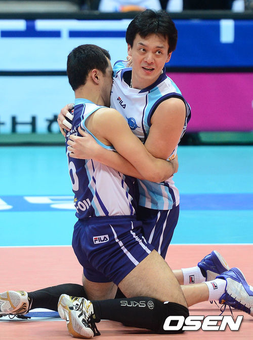 19일 오후 인천 도원체육관에서 열린 '2012-2013 NH농협 V-리그' 플레이오프 2차전 대한항공과 현대캐피탈의 경기 3세트 대한항공이 득점 후 최부식과 이영택이 포옹을 하고 있다.