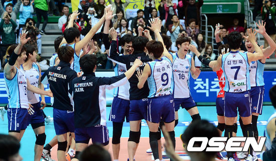 19일 오후 인천 도원체육관에서 열린 '2012-2013 NH농협 V-리그' 플레이오프 2차전 대한항공과 현대캐피탈의 경기 종료 후 대한항공 선수들이 환호하고 있다.