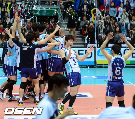 19일 오후 인천 도원체육관에서 열린 '2012-2013 NH농협 V-리그' 플레이오프 2차전 대한항공과 현대캐피탈의 경기 종료 후 대한항공 선수들이 환호하고 있다.