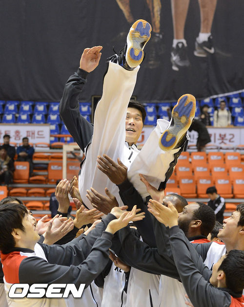 서장훈이 헹가래를 받고 있다./soul1014@osen.co.kr