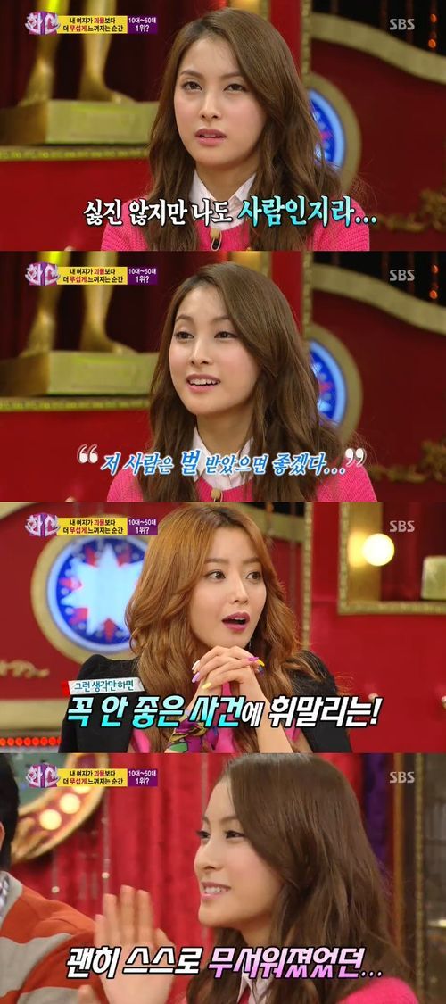 이에 출연진이 깜짝 놀라하자 규리는 "그래서 나는 내가 무서워서 이제 사람들을 별로 안미워한다"고 고백했다.