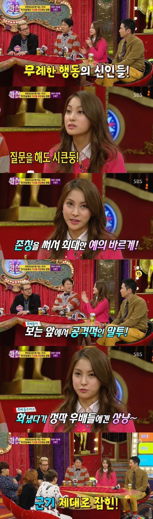 이어 "옆에 있던 매니저에게 오빠한테 일부러 공격적인 말투를 했다. 걸그룹한테 화가 난걸 매니저한테 푼 것처럼 연기했다"며 "방송시간이 되서 다시 후배들에게 상냥했다. 그런데 군기가 잡혀서 성실한 태도를 보여주더라. 가끔씩 그런 분들을 보면 그렇게 하고 싶다"고 남다른 기선제압법을 전해 출연진의 공감을 샀다.