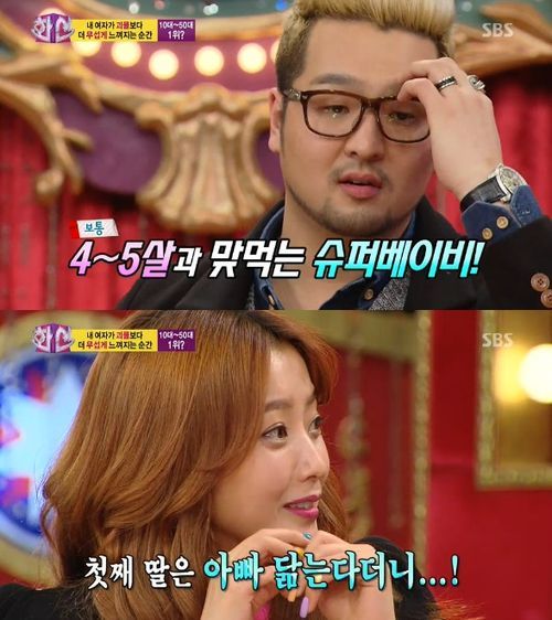 이날 김태우는 아내의 대단함을 전하기 전 "첫째 딸이 11개월인데 12kg이다"고 밝히자 출연진이 "4~5살과 맞먹는 슈퍼베이비다"고 놀라 했다.