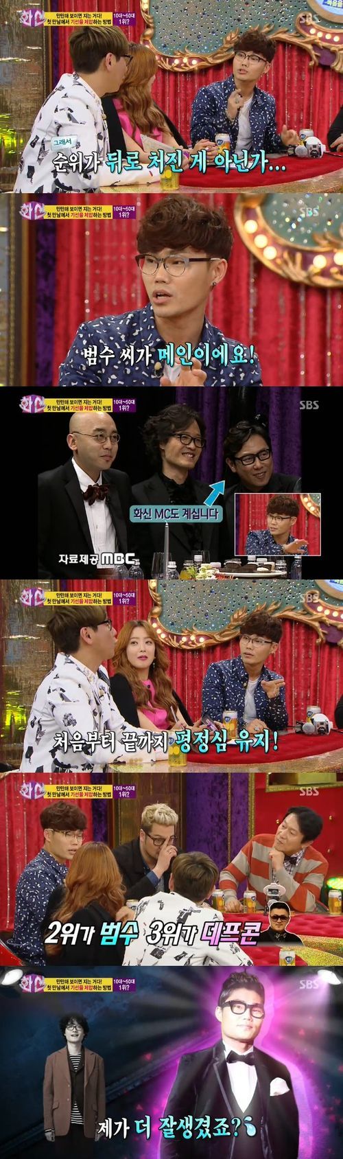 이날 '화신'에는 배우 김응수, 가수 김범수, 김태우, 걸그룹 카라의 규리가 출연해 '내 여자가 괴물보다도 더 무섭게 느껴질 때', '첫 만남에서 기선을 제압하는 방법'을 주제로 이야기를 나눴다.