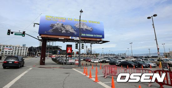 AT&T 경기장 앞에 독도 광고판이 크게 걸려 있다./jpnews@osen.co.kr