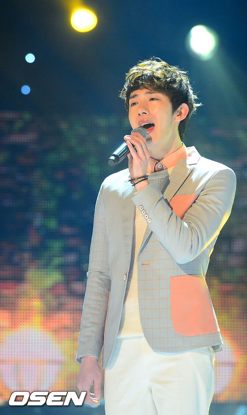 무대 위에서 2AM의 조권이 노래 '어느 봄날'을 열창을 하고 있다.
