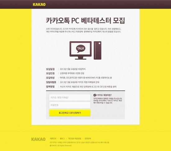 모바일 소셜 플랫폼 카카오는 20일, 카카오톡 PC 정식 출시에 앞서 일반 사용자 대상 카카오톡 PC 베타 테스터(이하 CBT)를 모집한다고 밝혔다. 3월 26일부터 진행되는 이번 CBT를 통해 카카오는 사용자 의견을 수렴하고 핵심기능을 선별해 카카오톡 PC의 완성도를 높일 계획.