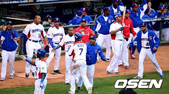 1회말 1사 1,3루 도미니카공화국 에드윈 엔카르나시온이 2타점 2루타를 쳐 홈을 밟은 호세 레예스와 로빈슨 카노를 선수들이 반갑게 맞이하고 있다./jpnews@osen.co.kr