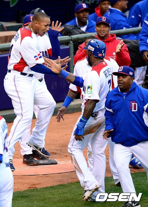 1회말 1사 1,3루 도미니카공화국 에드윈 엔카르나시온이 2타점 2루타를 쳐 홈을 밟은 호세 레예스와 로빈슨 카노를 선수들이 반갑게 맞이하고 있다./jpnews@osen.co.kr