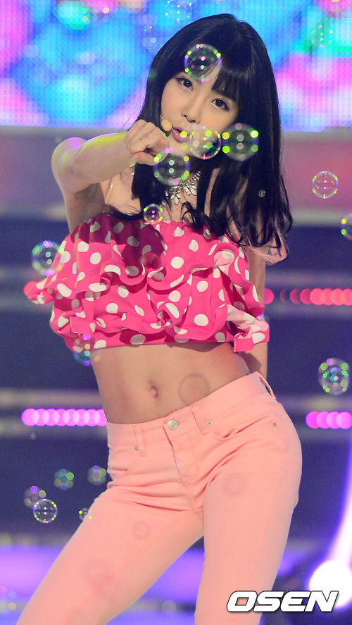 무대 위에서 레인보우의 현영이 노래 '텔미텔미'를 열창하며 화려한 안무를 선보이고 있다.