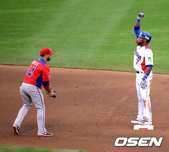 1회말 무사 도미니카공화국 선두타자 호세 레예스가 2루타를 치고 환호하고 있다./jpnews@osen.co.kr