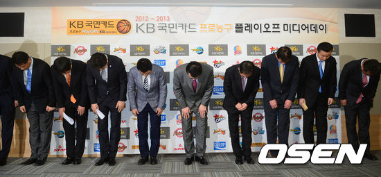 20일 오전 서울 논현동 KBL 센터에서 열린 '2012-2013 KB국민카드 프로농구' 플레이오프 미디어데이에서 10개 구단 감독들이 승부조작 사건에 대한 사과문을 발표 후 팬들에게 사죄의 인사를 하고 있다.