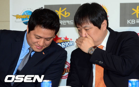 20일 오전 서울 논현동 KBL 센터에서 열린 '2012-2013 KB국민카드 프로농구' 플레이오프 미디어데이에서 문경은 감독과 이상범 감독이 이야기를 나누고 있다.