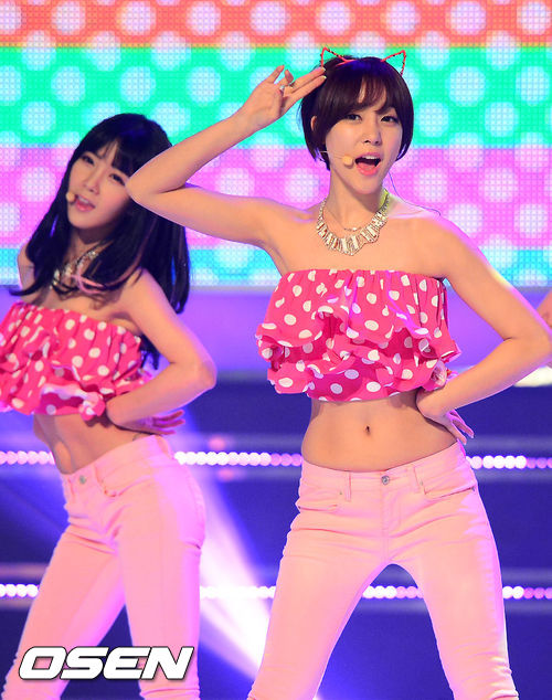 무대 위에서 레인보우의 조현영과 고우리가 노래 '텔미텔미'를 열창하며 화려한 안무를 선보이고 있다.