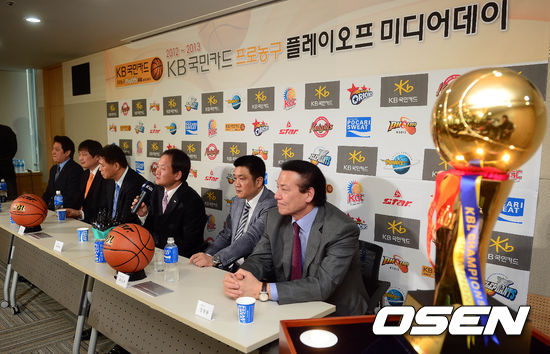 20일 오전 서울 논현동 KBL 센터에서 열린 '2012-2013 KB국민카드 프로농구' 플레이오프 미디어데이에서 6개 구단 감독들이 질의응답 시간을 갖고 있다.