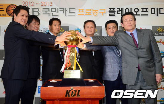 20일 오전 서울 논현동 KBL 센터에서 열린 '2012-2013 KB국민카드 프로농구' 플레이오프 미디어데이에서 6개 구단 감독들이 기념촬영을 하고 있다.