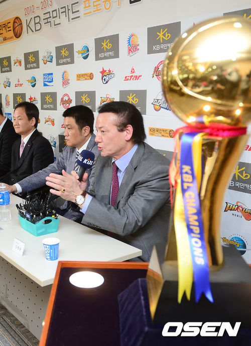 20일 오전 서울 논현동 KBL 센터에서 열린 '2012-2013 KB국민카드 프로농구' 플레이오프 미디어데이에서 김동광 감독이 질의응답 시간을 갖고 있다.