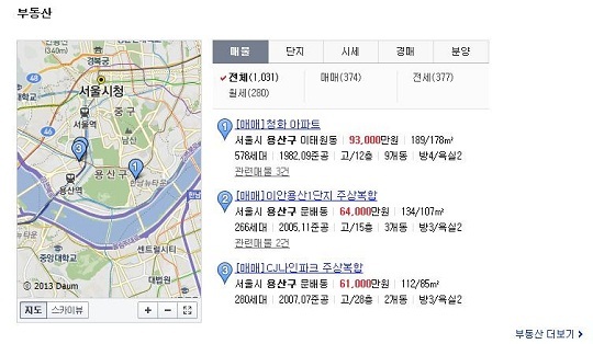 역세권이나 학군 중심으로 매물을 검색하고자 하는 이용자들을 위해 ‘한남역 근처 아파트’, ‘서울한남초등학교 근처 아파트’ 등과 같은 형태로도 매물을 찾아볼 수 있도록 지원한다. 만약 지역을 정하지 못한 이용자라면, ‘아파트 매매’, ‘아파트 전세’ 등으로 검색해 시세에 따라 지역을 좁혀나가며 매물을 탐색할 수 있다. 단순 매물뿐만 아니라 경매, 분양 정보도 함께 제공한다.