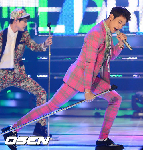 무대 위에서 샤이니의 민호가 '드림걸'을 열창하며 화려한 안무를 선보이고 있다.