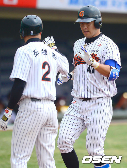 20일 오후 부산 사직구장에서 열린 '2013 한국야쿠르트 세븐 프로야구' 롯데 자이언츠와 LG 트윈스의 시범경기, 1회말 1사 3루 롯데 강민호가 역전 2점 홈런을 날리고 조성환과 하이파이브를 하고 있다