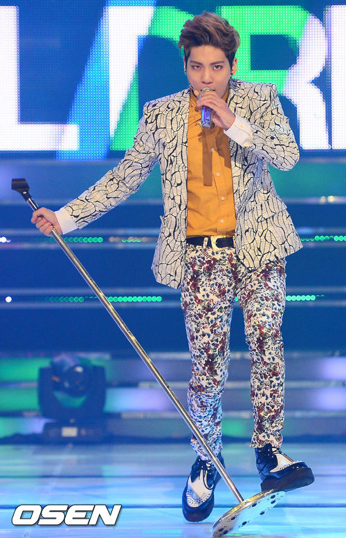 무대 위에서 샤이니의 종현이 '드림걸'을 열창하며 화려한 안무를 선보이고 있다.