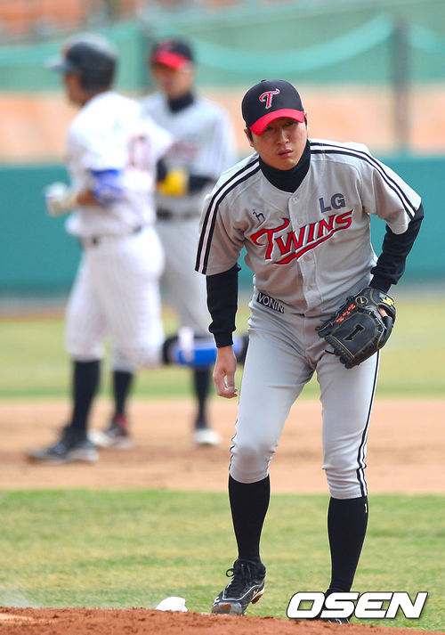 20일 오후 부산 사직구장에서 열린 '2013 한국야쿠르트 세븐 프로야구' 롯데 자이언츠와 LG 트윈스의 시범경기, 1회말 1사 3루 롯데 강민호에게 역전 2점 홈런을 허용한 LG 선발투수 우규민이 아쉬워하고 있다