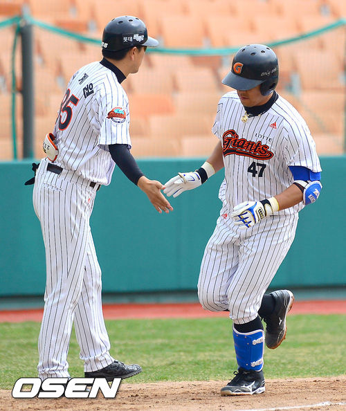 20일 오후 부산 사직구장에서 열린 '2013 한국야쿠르트 세븐 프로야구' 롯데 자이언츠와 LG 트윈스의 시범경기, 1회말 1사 3루 롯데 강민호가 역전 2점 홈런을 날린뒤 박계원 코치와 하이파이브를 하고 있다