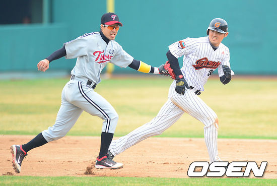 20일 오후 부산 사직구장에서 열린 '2013 한국야쿠르트 세븐 프로야구' 롯데 자이언츠와 LG 트윈스의 시범경기, 2회말 1사 2루 롯데 김문호의 내야땅볼때 LG 정성훈 3루수가 협살 걸린 2루 주자 박종윤을 태그아웃시키고 있다