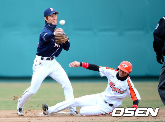 20일 오후 대전 한밭구장에서 열린 '2013 한국야쿠르트 세븐 프로야구' 한화 이글스와 두산 베어스의 시범경기, 1회말 무사 1,2루 한화 김태완 타석때 두산 고영민이 1루 주자 하주석을 포스아웃 시킨 뒤 1루로 송구하고 있다.