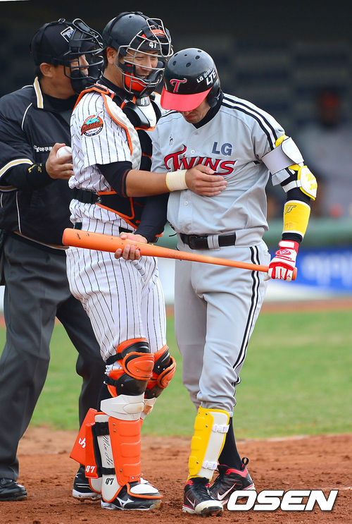 20일 오후 부산 사직구장에서 열린 '2013 한국야쿠르트 세븐 프로야구' 롯데 자이언츠와 LG 트윈스의 시범경기, 3회초 2사 1루 롯데 강민호 포수가 헛스윙 후 중심을 잃은 LG 정성훈을 잡으며 미소 짓고 있다