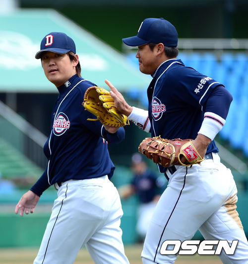 20일 오후 대전 한밭구장에서 열린 '2013 한국야쿠르트 세븐 프로야구' 한화 이글스와 두산 베어스의 시범경기, 2회말 두산 김선우가 이닝을 마무리 하고 더그아웃으로 들어가면서 홍성흔과 하이파이비를 하고 있다.