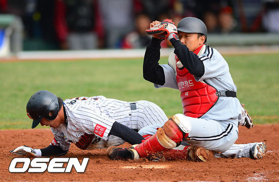 20일 오후 부산 사직구장에서 열린 '2013 한국야쿠르트 세븐 프로야구' 롯데 자이언츠와 LG 트윈스의 시범경기, 7회말 2사 2루 롯데 박종윤의 안타때 2루 주자 정훈이 LG 윤요섭 포수에게 태그아웃되고 있다