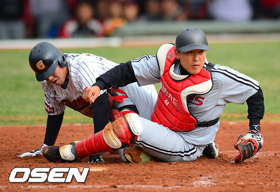 20일 오후 부산 사직구장에서 열린 '2013 한국야쿠르트 세븐 프로야구' 롯데 자이언츠와 LG 트윈스의 시범경기, 7회말 2사 2루 롯데 박종윤의 안타때 2루 주자 정훈이 LG 윤요섭 포수에게 태그아웃되고 있다