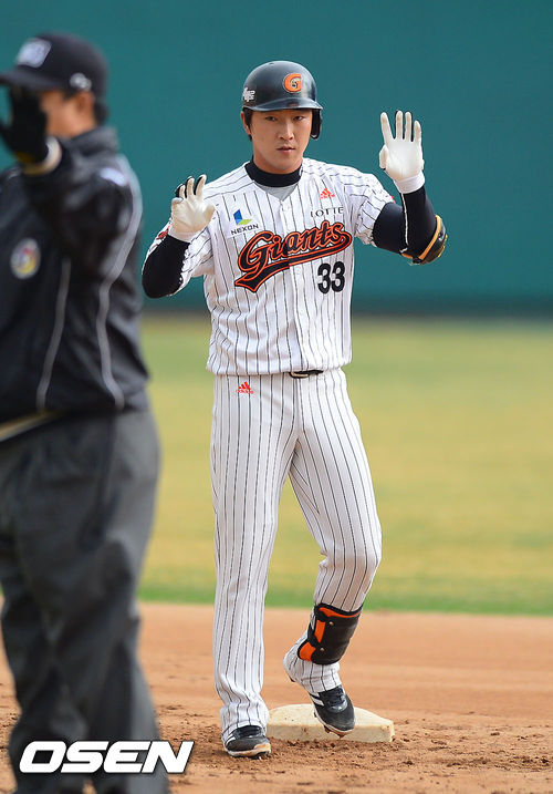20일 오후 부산 사직구장에서 열린 '2013 한국야쿠르트 세븐 프로야구' 롯데 자이언츠와 LG 트윈스의 시범경기, 7회말 2사2,3루 롯데 정훈이 2타점 적시타를 날린후 타임을 요청하고 있다