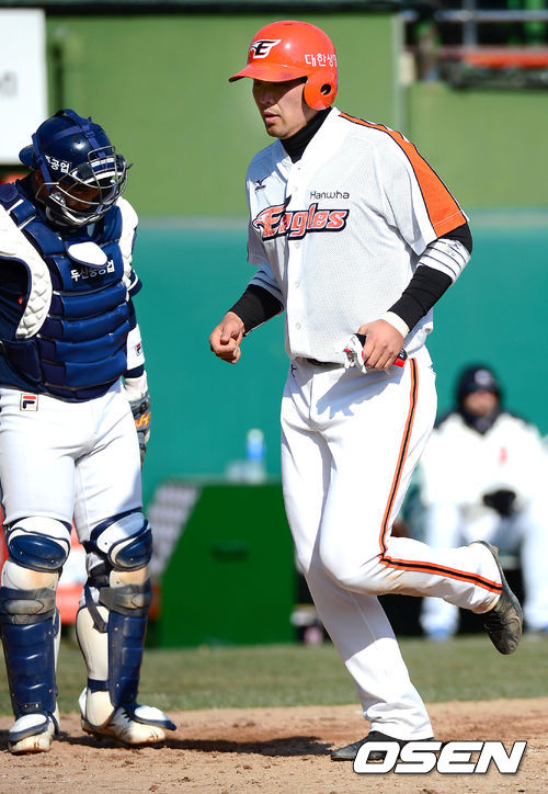 20일 오후 대전 한밭구장에서 열린 '2013 한국야쿠르트 세븐 프로야구' 한화 이글스와 두산 베어스의 시범경기, 8회말 1사 만루 3루주자 김태완이 이대수의 밀어내기 볼넷으로 득점을 올리고 있다.