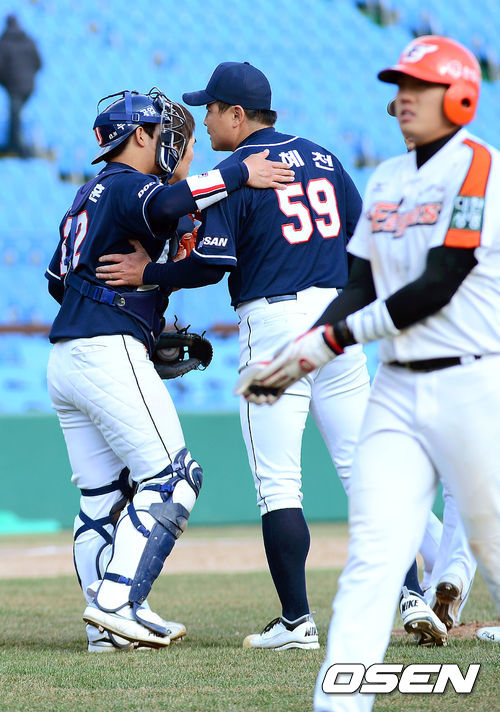 경기 종료 후 승리를 거둔 두산 이혜천과 최재훈이 기뻐하고 있다. / youngrae@osen.co.kr