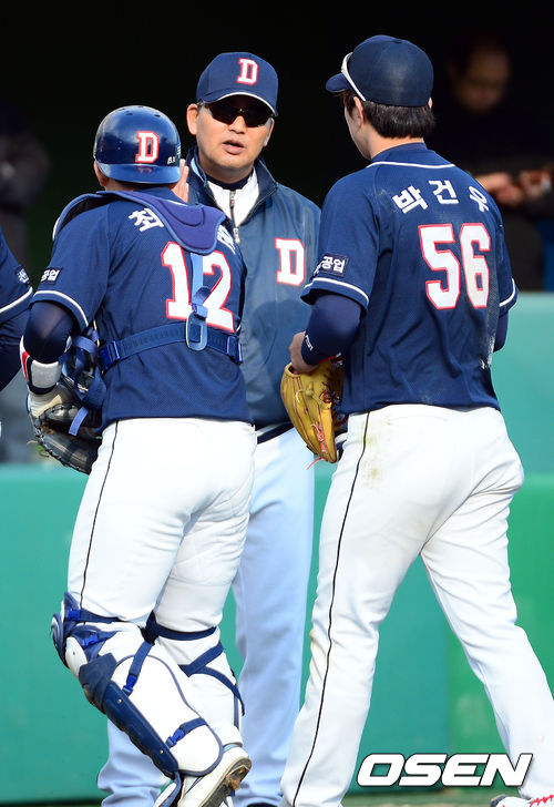 경기 종료 후 승리를 거둔 두산 김진욱 감독이 더그아웃으로 들어오는 최재훈, 박건우와 하이파이브를 하고 있다. / youngrae@osen.co.kr