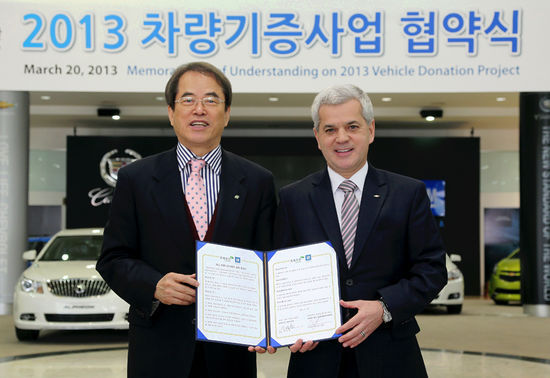 이를 위해 한국지엠은 20일, 한국지엠 부평 본사 홍보관에서 한국지엠 세르지오 호샤사장을 비롯해 이제훈 초록우산 어린이재단 회장과 이홍렬 홍보대사 등 관계자들이 참석한 가운데 ‘2013년 차량기증사업’에 대한 상호협약을 맺고, 전국 사회복지기관 및 시설에 차량을 전달했다.