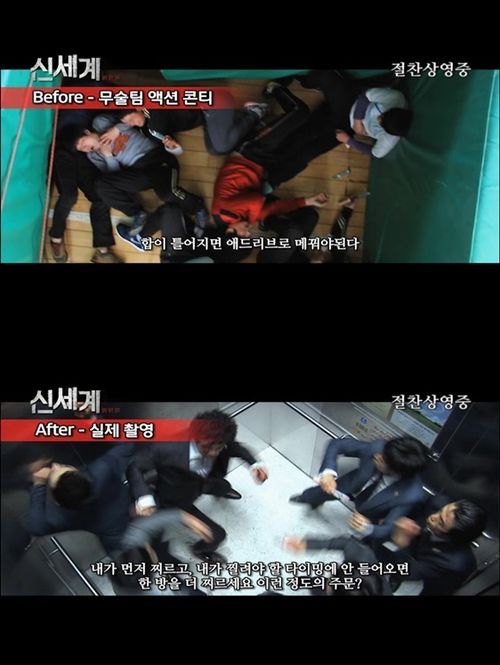 엘리베이터 액션 신의 콘셉트를 시장에서 파는 미꾸라지 떼가 바글거리는 모습에서 착안했다고 해, 일명 ‘미꾸라지’ 액션으로 불리는 엘리베이터 액션 신의 실제 촬영은 무술팀의 사전 준비와 배우의 애드리브가 만나 제대로 빛을 발했다고.
