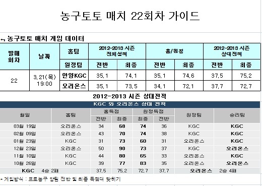 [농구토토] 국내 농구팬들은 오는 22일에 열리는 2012-2013시즌 국내프로농구(KBL) 6강 플레이오프 1차전 KGC-오리온스전에서 양 팀의 치열한 접전을 내다봤다.