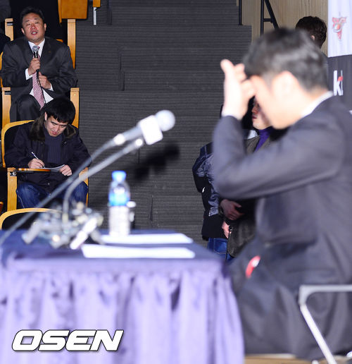 21일 오전 서울 종로구 KT 광화문 올레 스퀘어 1층 드림홀에서 열린 농구선수 서장훈의 은퇴 기자회견에서 KT 전창진 감독이 서장훈에게 질문을 하고 있다.