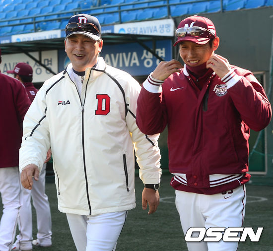 21일 오후 서울 목동구장에서 열리는 '2013 한국야쿠르트 세븐 프로야구' 넥센 히어로즈와 두산 베어스의 시범경기 시작 전 김진욱 감독과 염경엽 감독이 이야기를 나누며 미소를 짓고 있다.