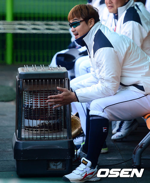 21일 오후 서울 목동구장에서 열리는 '2013 한국야쿠르트 세븐 프로야구' 넥센 히어로즈와 두산 베어스의 시범경기 시작 전 홍성흔이 덕아웃에 있는 난로로 추위를 녹이고 있다.