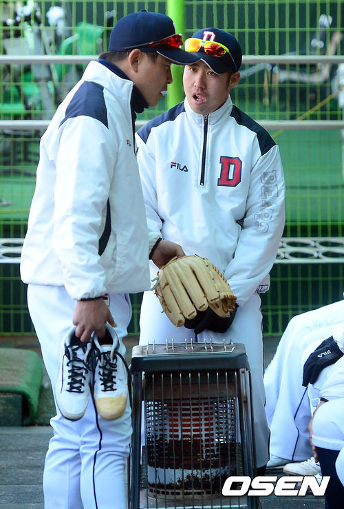 21일 오후 서울 목동구장에서 열리는 '2013 한국야쿠르트 세븐 프로야구' 넥센 히어로즈와 두산 베어스의 시범경기 시작 전 유희관과 이혜천이 난로를 쬐고 있다.
