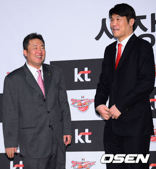 21일 오전 서울 종로구 KT 광화문 올레 스퀘어 1층 드림홀에서 열린 농구선수 서장훈의 은퇴 기자회견에서 서장훈이 KT 전창진 감독과 포옹을 한 후 즐겁게 얘기를 나누고 있다.